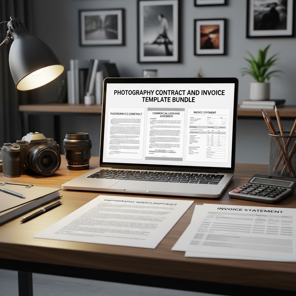 A comprehensive digital bundle of professionally written photography contract templates and invoice designs covering portrait sessions, wedding packages, commercial licensing, event coverage, and print sales. Each contract includes essential clauses for usage rights, cancellation policies, payment schedules, liability limitations, and delivery timelines. Invoice templates feature professional layouts with payment terms, package itemization, and tax calculation fields. Designed for photographers who want to protect their business, get paid on time, and present a polished professional image in every financial interaction with clients. Consult with a legal professional before use.